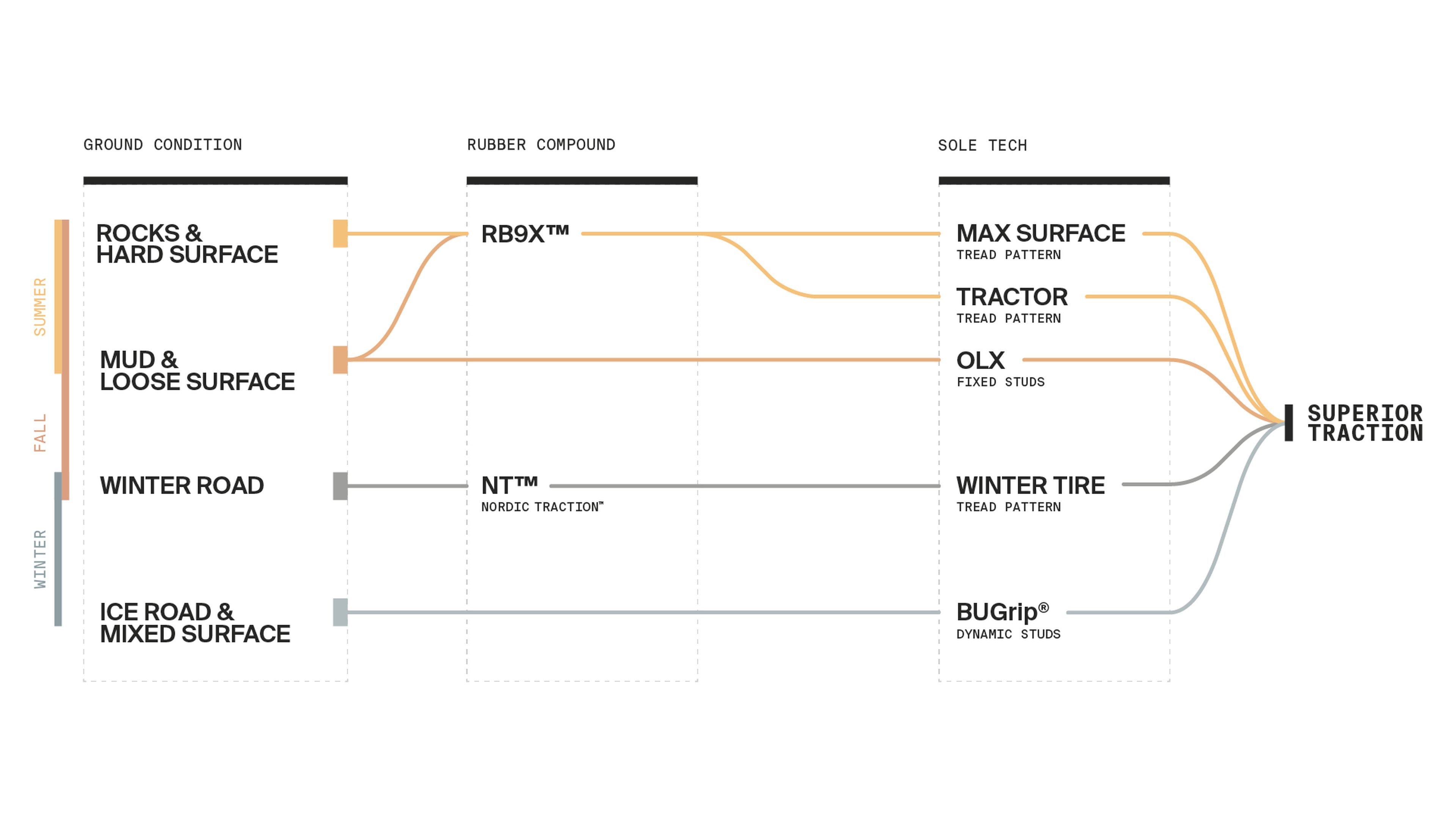 We currently work with four different traction technologies: BUGrip®, RB9X™, Nordic Traction™, and OLX. Together, they cover all seasons and needs – from ice and snow to wet rocks and muddy trails. In this guide, we describe our traction technologies and their specific areas of use, so you can find the perfect grip for you.